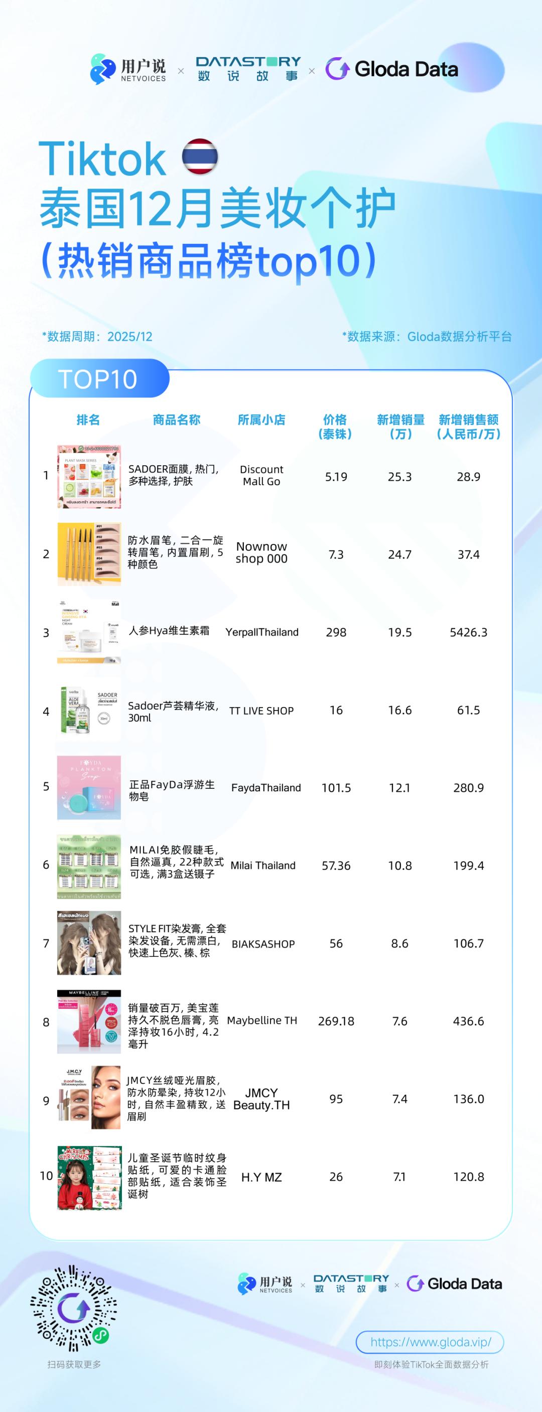 品牌层面,本土经典产品依然构成市场的长期基本盘。SADOER面膜持续稳居榜首,其后续推出的芦荟精华液也登上榜单,验证了以单一爆品建立信任,再进行品类延伸的可复制路径;Nownow防水眉笔作为长期在榜单品,则证明在眉部等高频刚需品类中,高性价比产品具备显著的长尾效应;Yerpall Thailand的人参面霜多次上榜,也反映出草本与滋养叙事在当地的稳定吸引力。