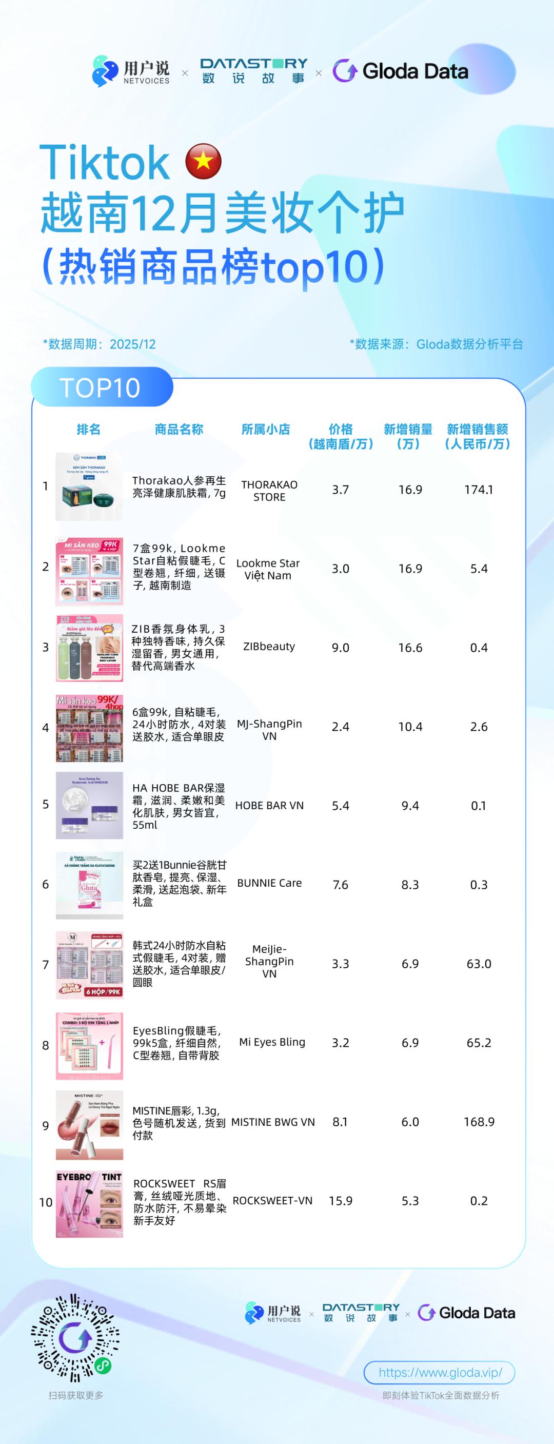 此外,传统草本成分的现代化应用在越南持续获得认可。Thorakao的人参再生亮泽面霜继9月后再次登顶,显示出当地消费者对人参等传统草本成分的长期信任。该产品将美白、保湿、抗衰老、修复与抗紫外线等多重功效整合于现代护肤形态中,并可作为妆前底霜使用,兼顾功能性与使用便捷性,最终以3.7万越南盾的价格,售出了16.9万件。