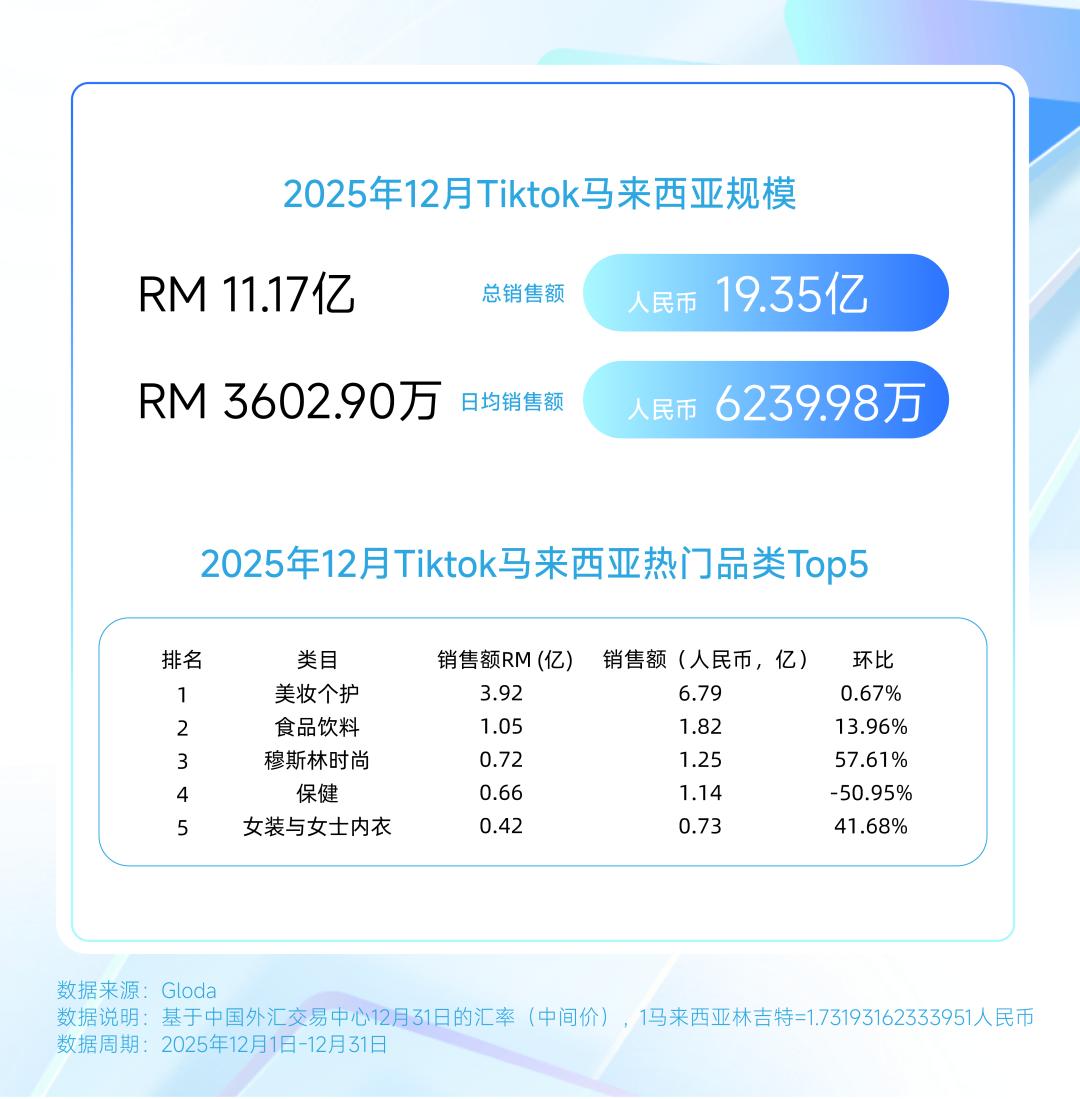 2025年12月,马来西亚TikTok平台整体销售规模达到11.17亿马来西亚林吉特(约合人民币19.35亿元),平台交易表现整体平稳。