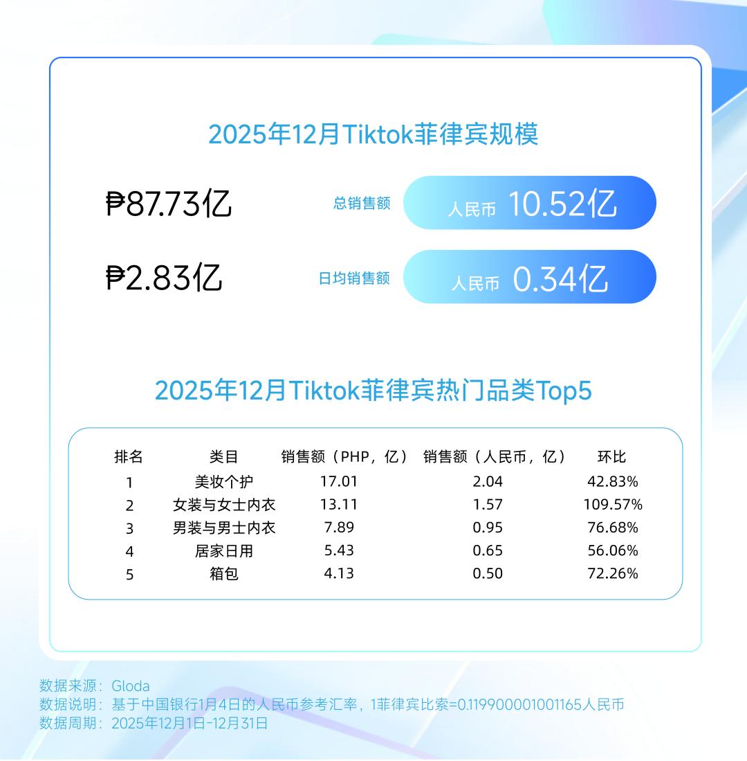 菲律宾TikTok市场12月销售额为87.73亿菲律宾比索(约合人民币10.05亿元),在圣诞季带动下保持稳健增长。